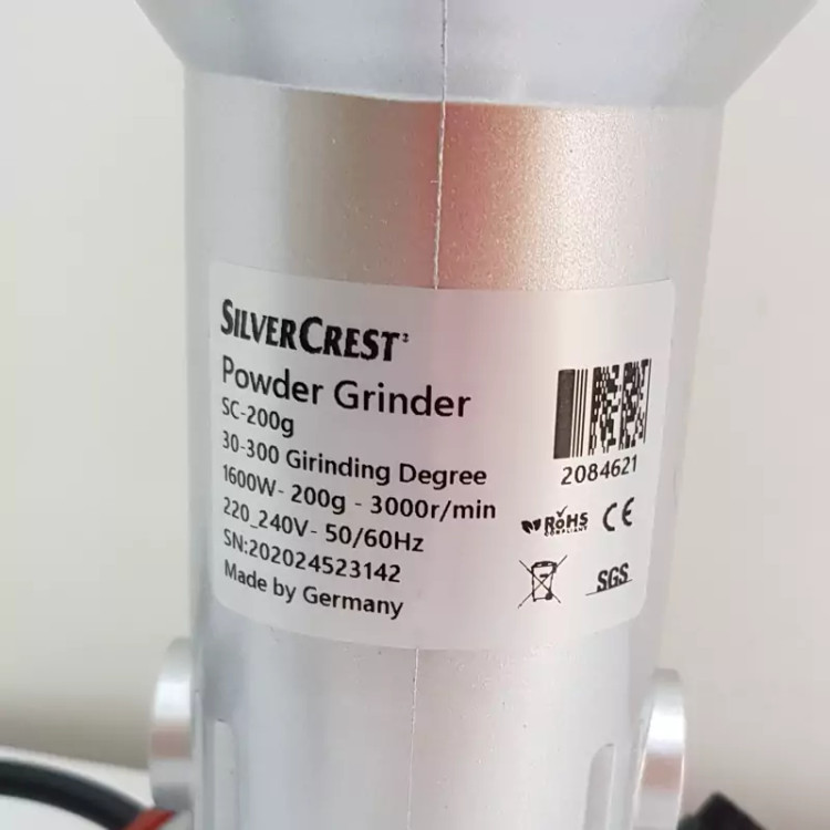 آسیاب صنعتی سیلور کرست جرمنی حک شده 200 گرمی 4 تیغ 1600 وات داری تیغه و زغال اضافه مدل 200g اصلی بدنه خط خوردگی دارد،
