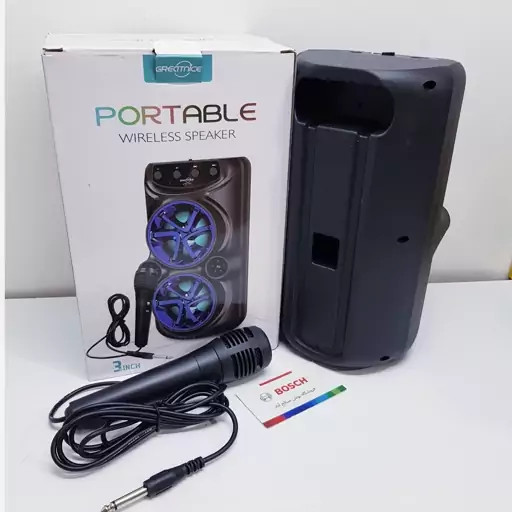 همراه با میکروفون: میکروفون همراه این اسپیکر امکان اجرای کارائوکه، سخنرانی یا استفادههای حرفهایتر را برای شما فراهم میکند.